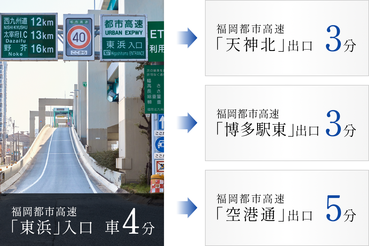 福岡都市高速「東浜」入口まで、約4分。