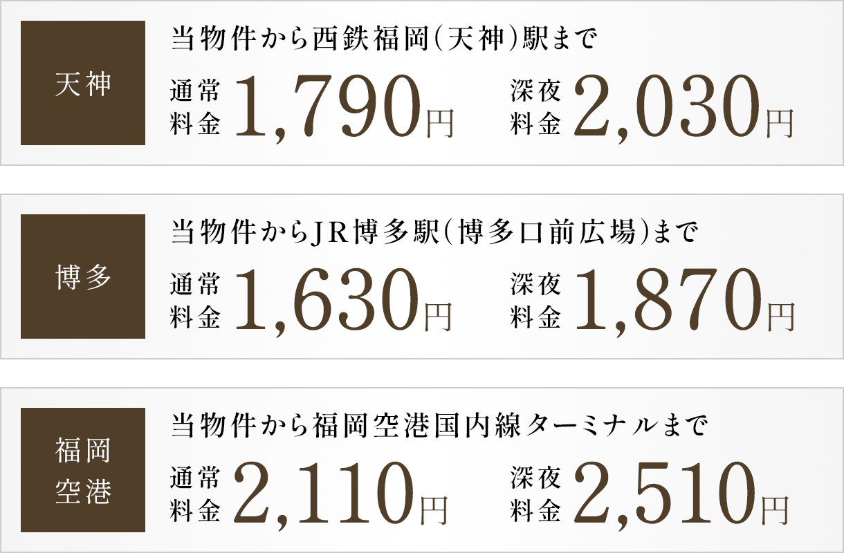 ※タクシー料金は「タクシーサイト」にて検索(2025年9月)。※検索結果は福岡A地区(福岡交通圏)の距離制運賃制度に基づき算出したもので、時間距離併用制運賃は含みません。