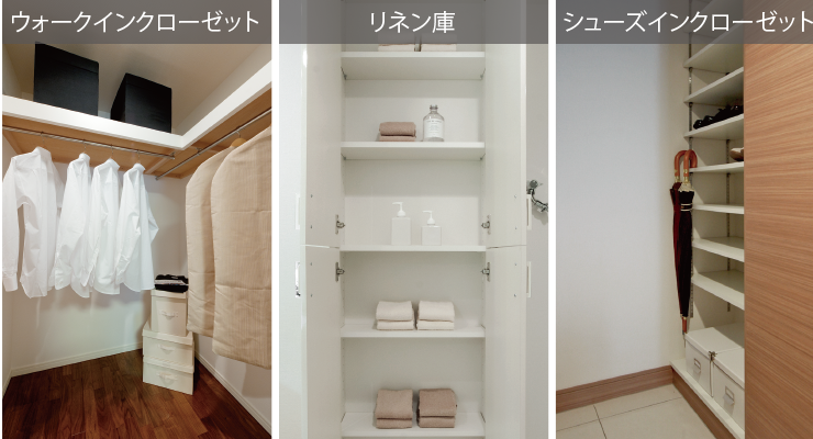 暮らしていく中で増えていく小物や服類。いつだって空間はシンプルでスッキリしていたい、という声から全邸にウォークインクローゼットを標準採用。機能的な収納を実現します。※リネン庫はAタイプ、Cタイプのみ