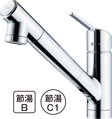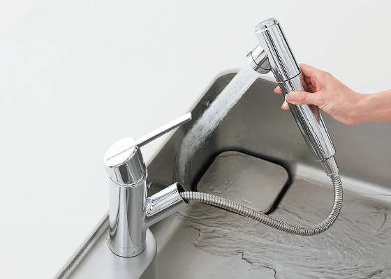 蛇口と浄水器がひとつになった蛇口一体型浄水器を採用。浄水と原水の切替はワンプッシュででき、浄水器部ごとホースが引き出せるハンドシャワー式のため、浄水でシャワーをたっぷり使えて料理の下ごしらえにとても便利です。