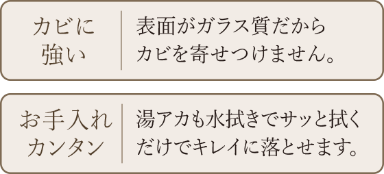 パネル表面に焼き付けて密着コーティングしているガラス質の層の効果で、汚れが染み込まず、カビも寄せつけない※1ホーロークリーン浴室パネル。普段のお手入れは入浴後にサッとシャワーで流すだけです。※1:ホーローパネルの表面に限ります。