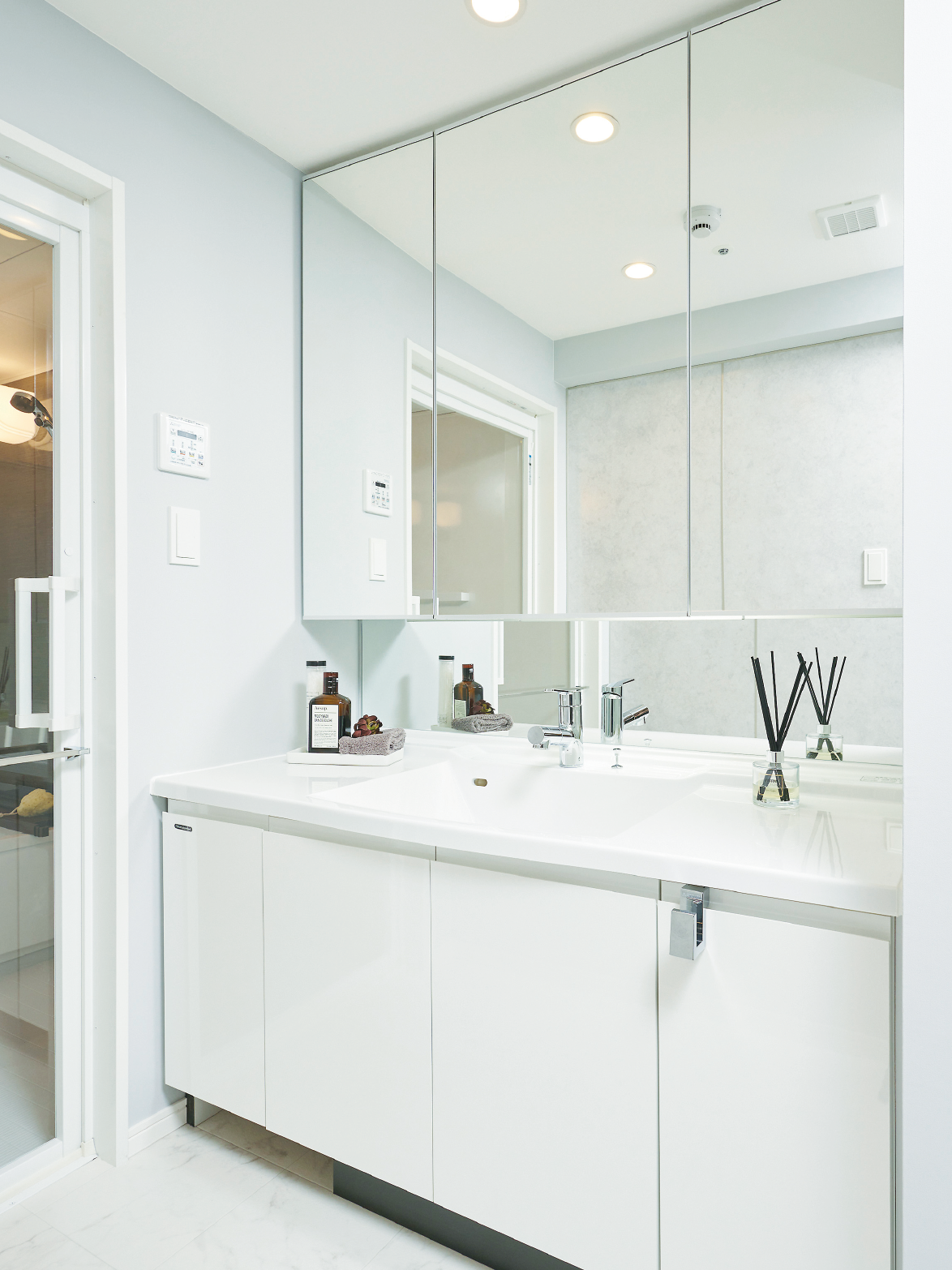 身支度がはかどる便利な三面鏡。扉背面にたっぷり収納できるスペースを確保しました。棚の高さは収納物に合わせて調節できるので、とても収納しやすくなっています。小物をすっきりと収納することによりサニタリースペースをさわやかに演出します。