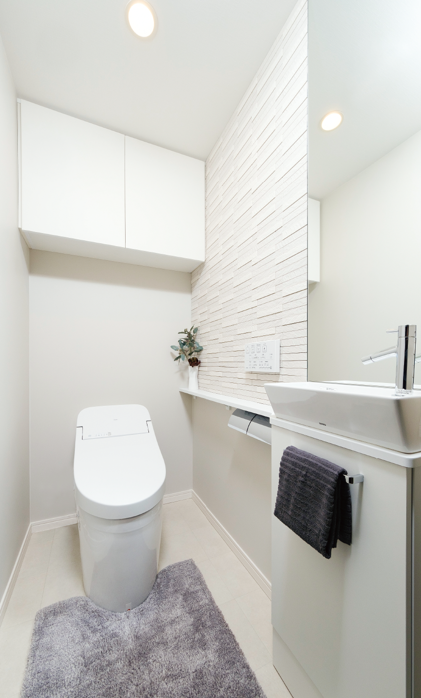 トイレには使い勝手の良い手洗いカウンターを設置。カウンター下のキャビネット内にはトイレのお掃除用品をスッキリ収納できます。