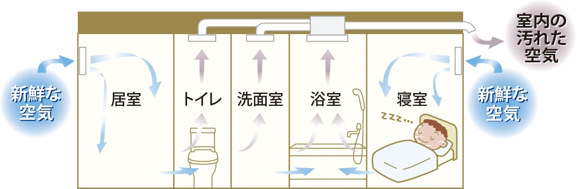 image住まいの空気をいつでも快適に。室内の汚れた空気・湿気・臭気をサニタリーから排出し、新鮮な外気を各居室に設置された自然給気口から取り入れます。