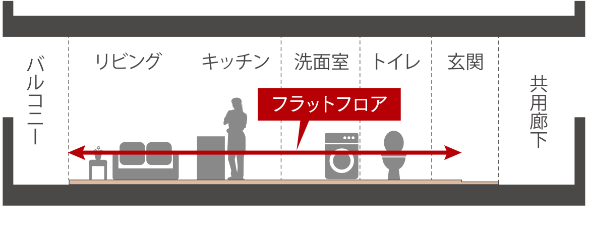 image住戸内は床に段差がないフルフラット設計を採用。室内でのつまずき事故を防止し、家具の移動や掃除がしやすい、安心・快適な住まいが実現します。
