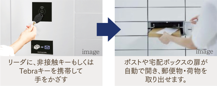 ポストと宅配ボックスを一体化させたポスタクを採用しました。宅配ボックスに荷物が届くと集合玄関機と室内インターホンで着荷をお知らせ。ポストも宅配ボックスも、Tebraキーをポケットにいれたままリーダに手をかざすだけで、郵便物や荷物を取り出すことができます。非接触キーの場合はリーダに鍵をかざすと解錠します。