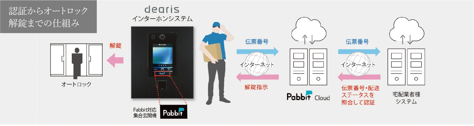 image荷物の伝票番号をクラウドで照合することで、オートロックを解錠するシステム『Pabbit』を採用しました。非対面でも住戸前まで荷物を届けてくれるので、1階から荷物を持って上がる必要がありません。また、伝票番号を知り得る人のみがオートロックを解錠できるため、宅配員のなりすまし等を予防します。