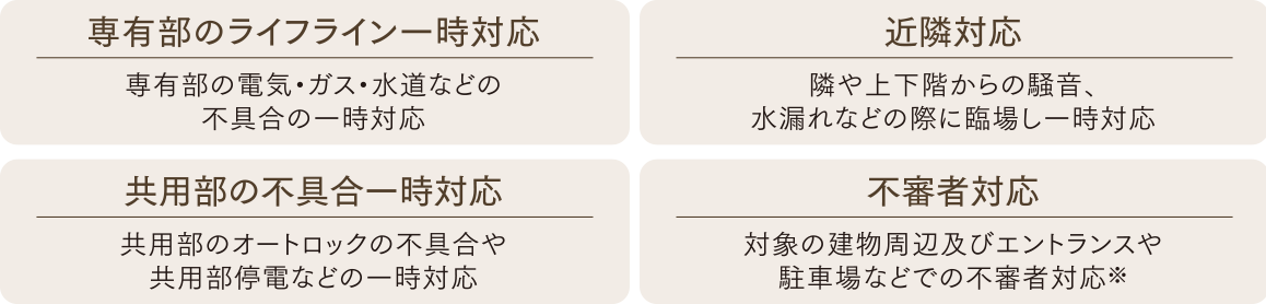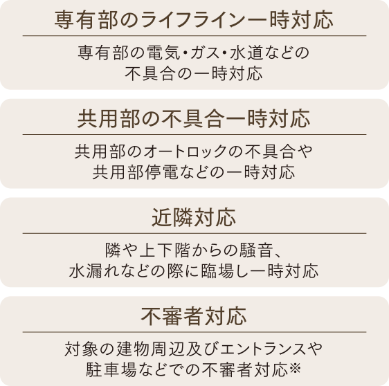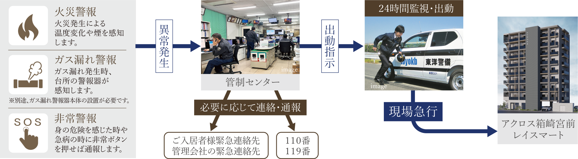 24時間365日体制で見守り、万が一の場合には、管制センターに自動通報され、マンションセキュリティのプロが迅速に対応します。入居者様の安心・安全な生活をサポートします。