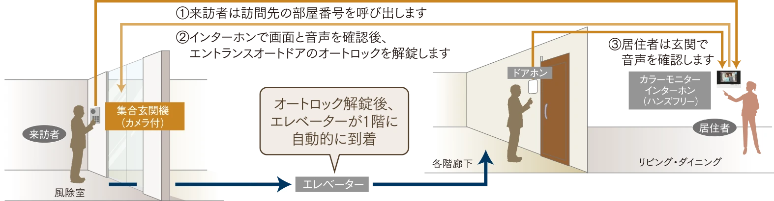 オートロックを解錠するとエレベーターが自動的に1階に到着します。来客時は居住者による居室インターホンからの解錠操作に連動し動作。利用者の待ち時間が低減されます。