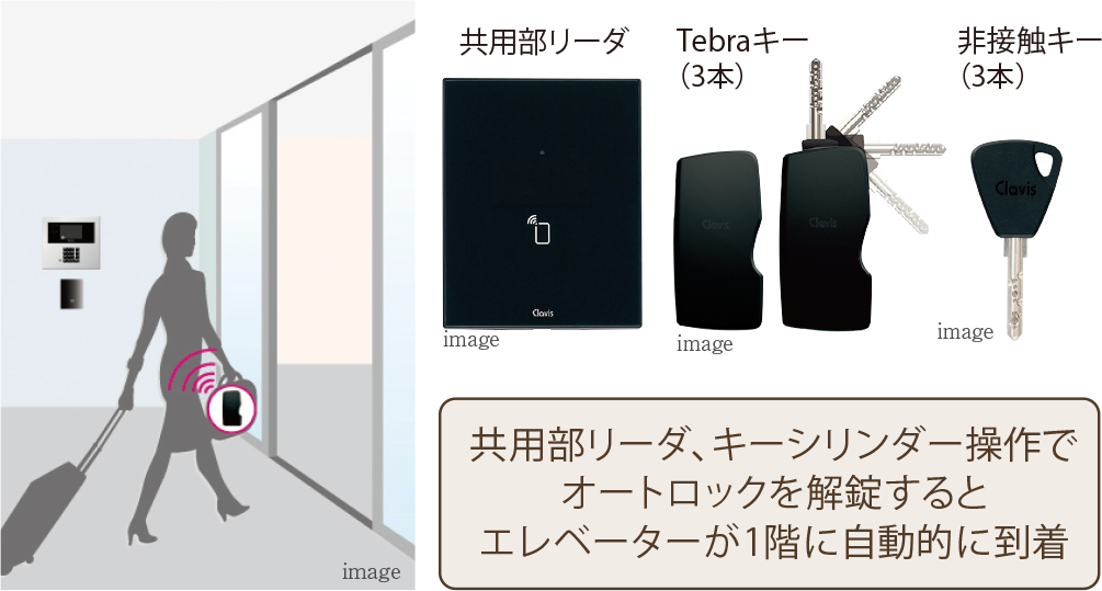 各住戸の玄関扉は、Tebraキーをカバンやポケットに入れたまま、リーダのボタンを押すだけで施錠・解錠が可能です。ワンタッチで確実にツーロックを作動させることができます。また、非接触キーの場合はボタンを押してリーダに鍵をかざすと施錠・解錠します。