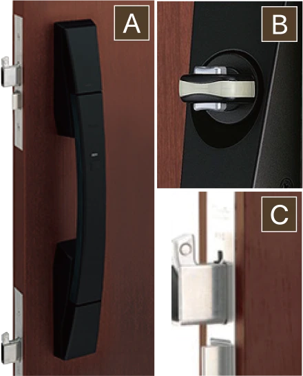2箇所の本締錠で高い防犯性を実現しています。誰でも操作がしやすい、バリアフリー設計です。