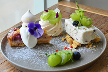 季節のフルーツを使ったデザートとコーヒーを、ゆったりと楽しめるカフェ。人気の月替わり「デザートプレート」をはじめ、店内で提供するスイーツはすべて、パティシエが一つひとつ手作りしています。ケーキやタルト、クッキーなどが多彩に並び、ギフトにも対応。普段使いにも、大切な日にも、おすすめです。