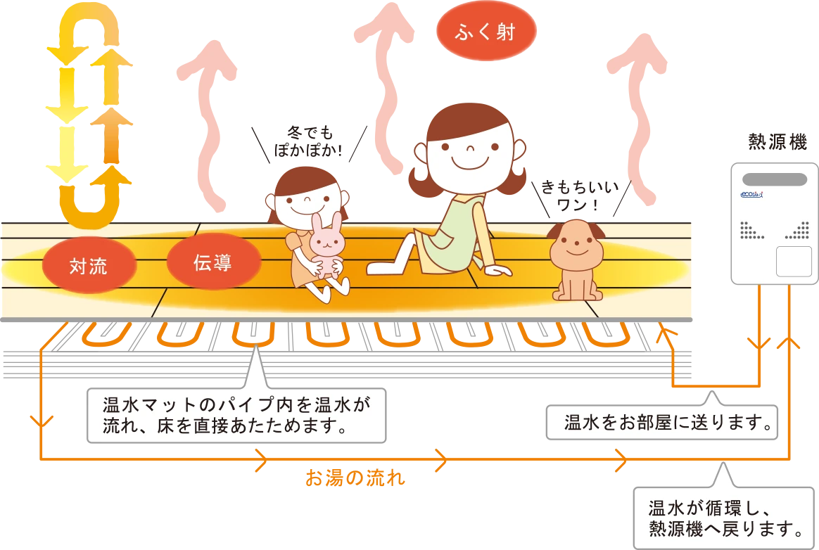 エアコンによる暖房は足元が寒くて、頭がぼーっとしがち。床暖房なら、体にやさしい「頭寒足熱」の快適空間が実現!床面を約26~30℃に保ち、足元から熱を伝えてじんわりと暖めます。