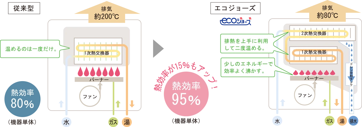 これまでのガス給湯器は、使用するガスのうち約20%が放熱や排気ガスとして無駄になっていました。エコジョーズでは、捨てていた排熱を再利用。ガスの使用量が減りガス代がお得になるとともに、CO²の排出量も削減します。