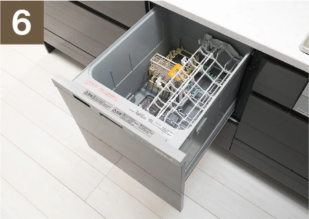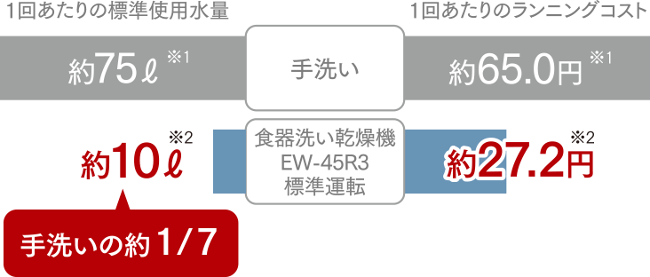 【試算条件】※1:【手洗い】<食器40点、小物(はし5膳、スプーン・フォーク各5点)はしは1膳=2点とする/水温約20℃>合計60点を約10Lのお湯(約40℃)でつけ置き。食器・小物に使う洗い&すすぎ水量は約40℃のお湯にして食器︓1.35L/点、小物0.55L/点使用する。洗剤は1回あたり315ml入り164円(税込)(日本電機工業会調べ)を9.6ml使用 ※2:【標準運転時】食器40点、小物(はし5膳、スプーン・フォーク各5点)はしは1膳=2点とする/水温約60℃、標準コース(洗い~乾燥で仕上げた場合。洗剤は1箱詰替え用600g入り475円(税込)(当社調べ)を5g使用。★ランニングコスト目安単価(税込) ●電力料金目安単価31円/kWh(税込)【2022年7月改定】(家電公取協調べ) ●ガス料金(都市ガス)222円/㎥(税込)(当社調べ) ●水道料金137円/㎥(税込) 、下水道使用料125円/㎥(税込)(日本電機工業会調べ)。[2024年12月現在]