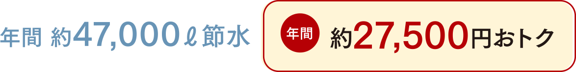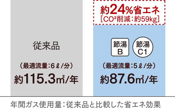 image【試算条件】●使用人数:4人家族●年間使用日数:365日●年間使用水量:シングルレバー湯水混合水栓約35,806L/年●使用料金:〈水道〉265円[税込]/㎥〈都市ガス〉199円[税込]/㎥●CO²換算係数:〈水道〉0.44kg/㎥〈都市ガス〉2.05kg/㎥※(一社)日本バルブ工業会「節湯水栓のエコ効果算出適用数値及び効果の例」より※節湯C1の削減率は地域によって異なり上記の削減率は東京が含まれる「地域6」の値です。他地域については(一社)日本バルブ工業会ホームページにて削減率をご確認ください。※税込表記です。